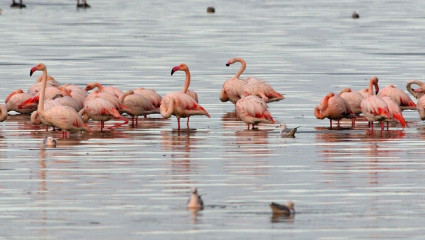 Den ganzen Tag über sind wir am Kerkinisee unterwegs. Die wattähnlichen Überschwemmungsflächen, die vom Deich aus gut einsehbar sind, bieten einen atemberaubenden Anblick, denn viele tausend Flamingos, Säbelschnäbler und Enten (Löffel- und Spießenten) halten sich hier zur Nahrungssuche auf. Oft stehen sie dicht mit Löfflern, Braunen Sichlern, Silber- und Seidenreihern zusammen. Immer wieder fliegen Krauskopfpelikane elegant, mit nur wenigen Flügelschlägen flach über das Wasser. Auf Wiesen sind die ersten nordischen Gänse anzutreffen, darunter dutzende Zwerggänse, die hier als größte Winterpopulation Europas rasten. Aus sicherer Entfernung wollen wir diese lebhafte Gans beobachten, aber doch so nah, um sie an ihren charakteristischen Merkmalen zu erkennen.In der Mittagsthermik lassen sich Schelladler und Schwarzstörche beobachten. Für Schelladler ist der Kerkinisee eines der wichtigsten Überwinterungsgebiete in Griechenland. Daneben erwarten wir weitere Greifvogelarten, wie Korn- oder sogar Steppenweihe, Sperber und Wanderfalke. Am Nachmittag beobachten wir am Fuße des Belesgebirges und suchen hier nach Zaunammer und der nicht immer einfach zu entdeckenden Balkanmeise. Sehr wahrscheinlich ist die Beobachtung des Steinadlers, der im unzugänglichen Gebirge seine Bahnen zieht.